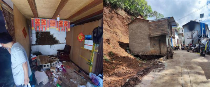 2025年6月25日起,玉溪市澄江市海口镇海关社区世家小组降雨量较大。6月26日20时40分左右,地质灾害群测群防员组织群众在巡查排查过程中发现在册地质灾害隐患点——世家小组不稳定边坡有坍塌趋势,直接威胁王立坤等4户村民生命财产安全,便立即组织受威胁的4户17人进行转移避险。6月26日20时45分左右,该不稳定边坡发生坍塌,造成王立坤户房屋损毁,对其他3户房屋及附近2个烤烟房造成一定程度的破坏。